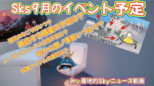 9月のSkyのイベントをニュース風?に紹介しています。再訪する精霊の予定は?設置アイテムの復刻はあるのか?陽光の日々はいつまで?陽光のなごりはいつからなのか?シーズンキャンドル2倍キャンペーンが開始?イベント季節「砕ケル闇ノ季節」はいつまでな…