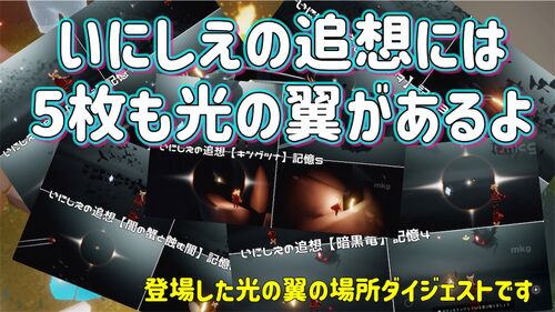 いにしえの追想には5枚も光の翼があるよ!! いつ追加されたかは分からないが…いにしえの追想の記憶の中(クラゲ)にも登場してきたよ! いままで登場してきた光の翼の場所ダイジェスト版です ※不具合いにしえな追想で記憶を再生できない不具合が発生していま…